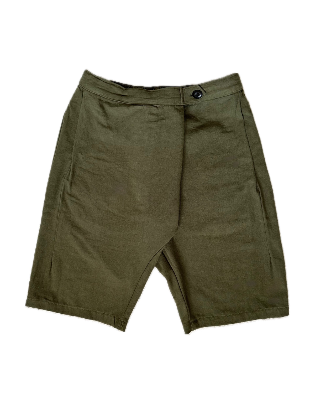 Unisex Souk Short in an organic sustainably-sourced lightweight hemp-cotton washed canvas woven fabric. Features an elastic back waistband, which provides a nice range for fitting the waist with comfort, cross over button closure, draw cord waist tie and slightly tapered leg.